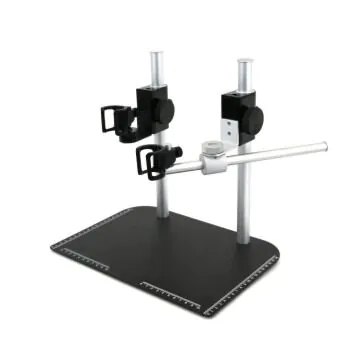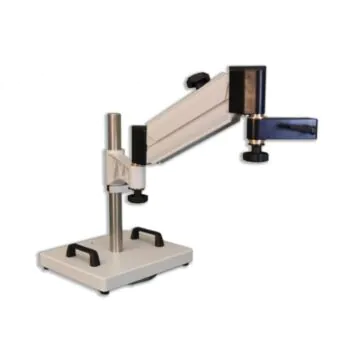 There are several general microscope stand designs. Many of these make use of a large, sturdy base, designed to rest on a table or desk, with a single pole or arm for mounting your microscope. Most of these mounting points are static, though some may pivot as much as 30 degrees. Other designs with more versatility include the boom or arm stand, where the scope is mounted to an articulated arm. These models often make use of a table clamp instead of using a solid base in order to provide a secure grip.