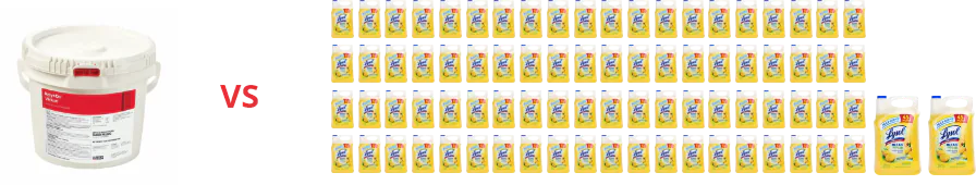 1 Pail of Rely+On™ Virkon™ mixed at proper dilution with ordinary tap water is equal to 81 x 210 oz bottles of the leading competitor brand.