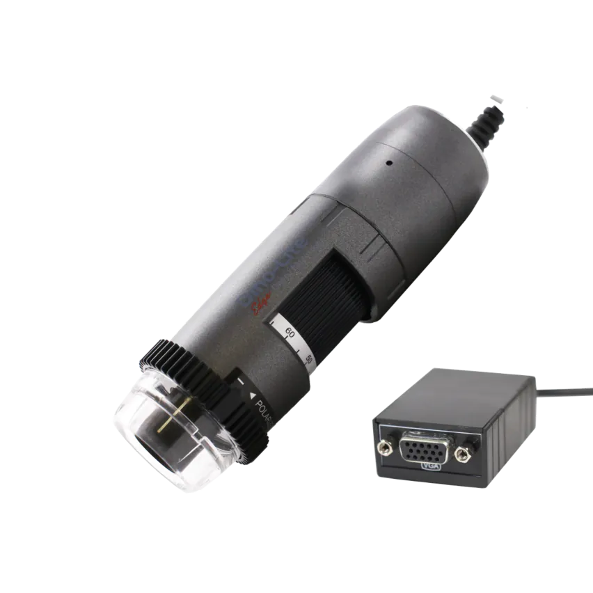 Enjoy vivid digital imagery without complex software with our new Dino-Lite Edge AM5216TF Series VGA polarizing microscope. Simply plug a standard VGA (DE15, D-SUB) cable into the VGA adapter on the microscope cord and plug directly into your computer monitor for fast, convenient imaging results without complicating software. The enhanced CMOS sensor provides striking color rendition, 1280 x 720 resolution and real time imaging at up to 60 fps.This new model also features a second-generation housing with a smoother focus wheel movement and a handy thumb wheel scroll lock. Once your magnification is set, slide the tab to the "Lock" position to secure the thumb-wheel. This keeps your image in sharp focus without further effort, a real time-saver during repetitive observations.