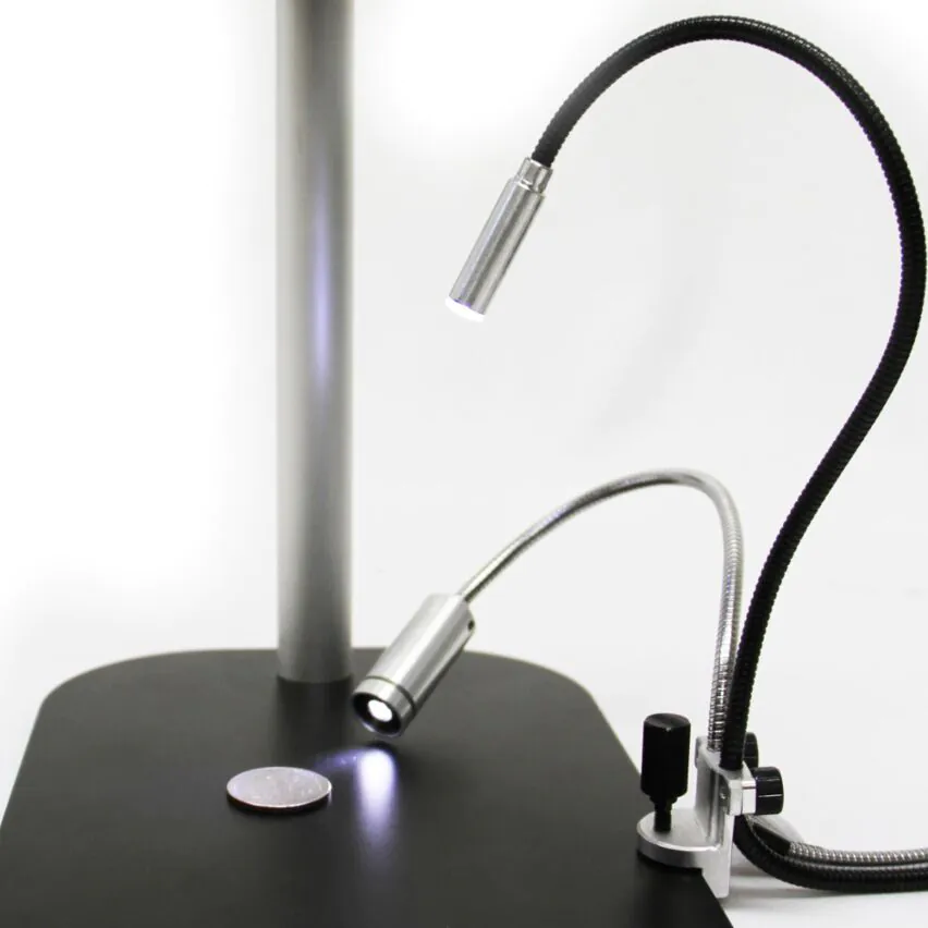The Dino-lite MSAK812 attachment kit includes two LED gooseneck LED lights powered by USB, a precision specimen holder and a compact and rugged mounting point for securing to an MS35B or MS36B base plate (sold separately) or other suitable surface. The lights offer additional side illumination which is very helpful in bringing out surface contrast and details not otherwise visible. A 4-port USB hub is included for convenient power distribution.