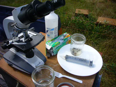 The photo above shows all the equipment you will need. I highly recommend the Omano OM36L microscope (shown), which has binocular eyepieces, battery power for field use, and a mechanical stage for moving the slide around (Microscope.com offers a “Beekeepers Special” for $394).
