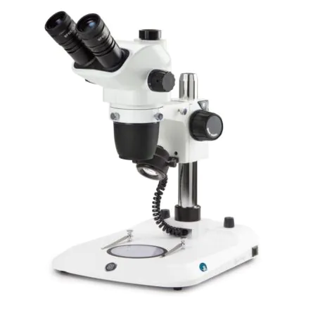 Binocular stereo zoom microscope NexiusZoom, 0.67x to 4.5x zoom objective, magnification from 6.7x to 45x with pillar stand. Two incident LED illuminations with Gooseneck and one transmitted 3 W LED illumination
