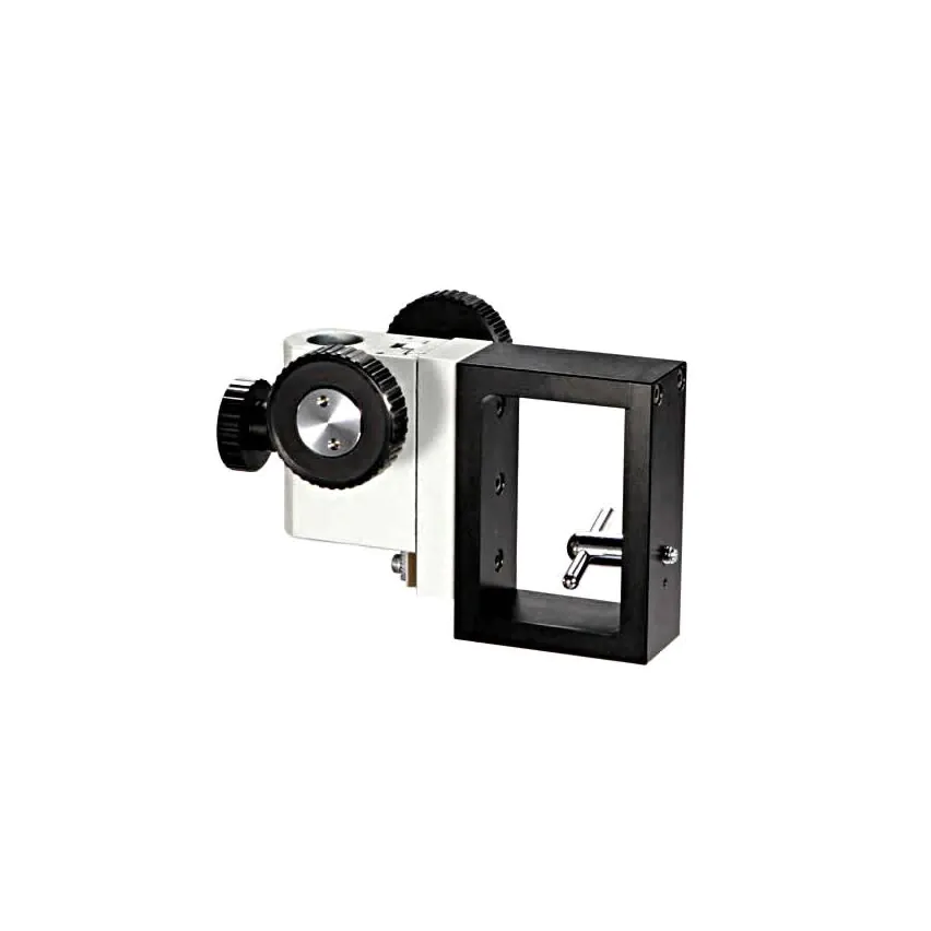 Meiji's FD Focus Block includes an open D-frame digital camera mount, secured by a standard size 1/4"-20 bolt. Dual coarse focus knobs operate machined rack and pinion gearing for smooth focusing movement. The dual focus knobs offer tension adjustment and a built-in slip clutch prevents damage to the mechanism. Fits 20mm diameter mounting pole.