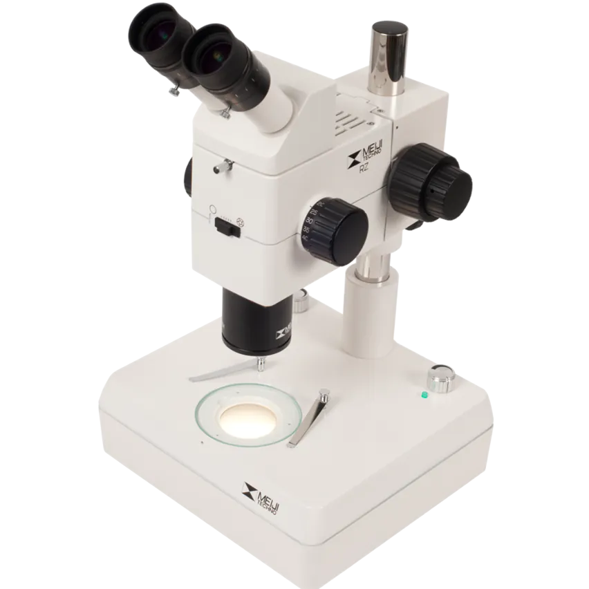 The RZB-P combines Meiji's CMO type zoom stereo body with binocular head and plain or LED stand for a research stereo microscope of exacting quality. Choose eyepieces and an objective to suit your application.