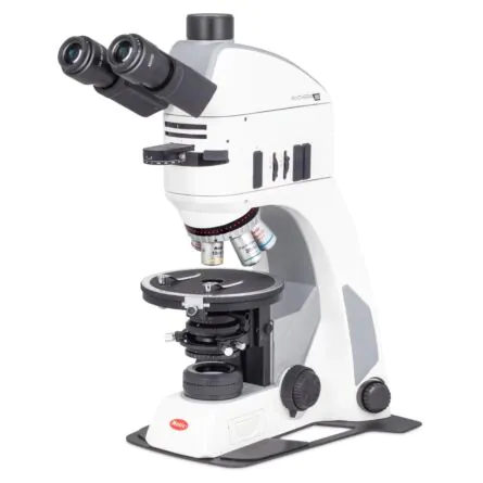 The Motic BA310POL is designed for materials science professionals examining birefringent specimens with efficiency and repeatability. Innovative features include a new generation of EC Plan Strain-Free objectives set in a reversed quadruple nosepipece and 10X high-eyepieces set in a 30-degree inclined Siedentopf binocular or trinocular head. Full polarization includes a rotatable analyzer with Bertrand lens and rotatable polarizer. Standard 6V30W Halogen illumination, a strain-free condenser and large mechanical stage round out an economical, versatile system suited for a wide range of petrography, minerology and materials science applications.