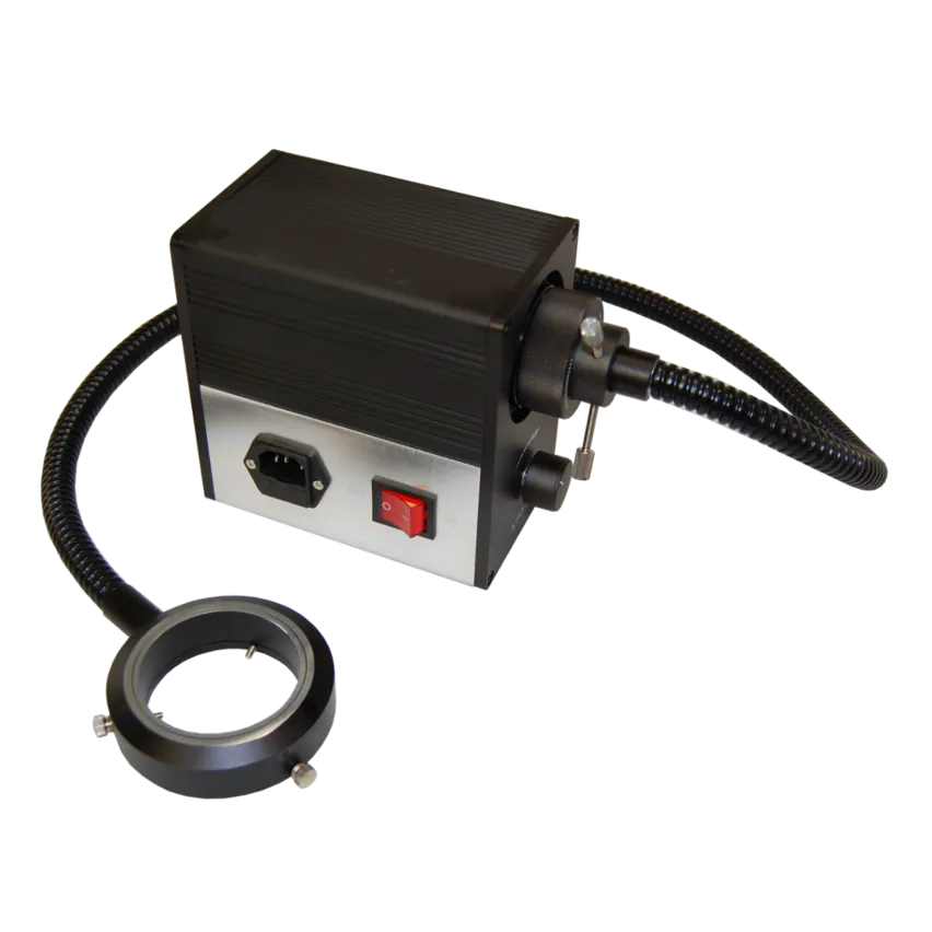 The ESD-Safe and UV-free LED light source accepts input voltage from 96V-265V and allows a continuous range of subdued or concentrated lighting, controlled by a rotary dimmer dial on the front panel. The 5/8" light guide receptacle allows secure fitment of the 39-incih flexible ring light guide and the 65mm ring diameter will fit a wide variety of modern stereo microscope bodies. Illumination intensity is variable from zero to full brightness and optional filters can be mounted in the receptacle for greater flexibility. A low-noise-signature forced-air cooling fan helps to ensure a trouble-free, 10,000 hour service life for the 24W LED bulb. The lamp color temperature is 5600K at 1600 lumen output, providing cool, shadow-free illumination for PCB inspection, materials failure analysis, manufacturing quality assurance and many others.
