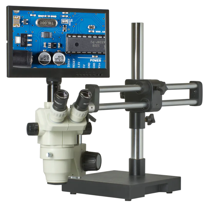 This high quality combination includes OptixCam's high resolution CX-3 1080p LVDS microscope camera/display with Omano's top of the line OM99-T trinocular stereo zoom microscope head and premium V15 dual-arm boom stand. With excellent optics throughout the microscope system, it is an industrial inspection system that can also be used as a standard optical microscope using the included super wide field, SWF10x eyepieces.