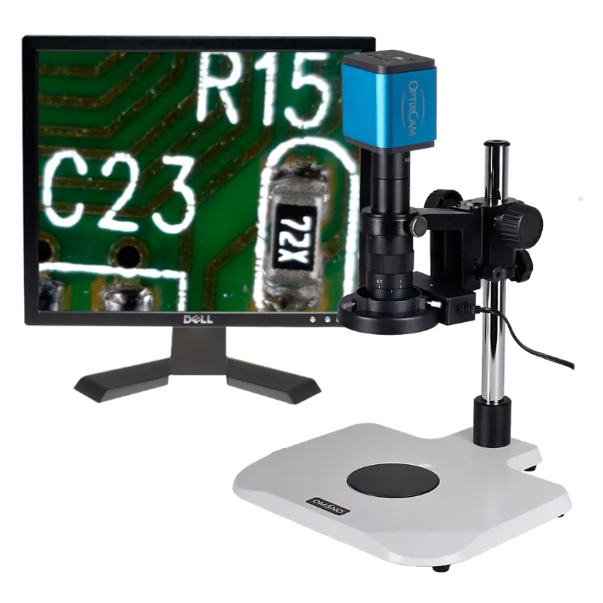 This industrial microscope inspection system combines the vivid, high-speed response of the new 1080PU series HDMI & USB2.0 digital microscope camera with our brand new Omano VIDZ-650 6X-50X zoom inspection lens and your choice of seven different Omano boom stands.