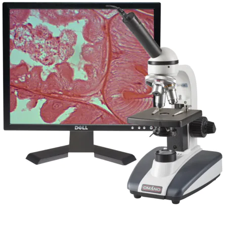 The Omano OM118-M4 is a high-power monocular microscope used for viewing cellular structures on slides. This student compound microscope features: