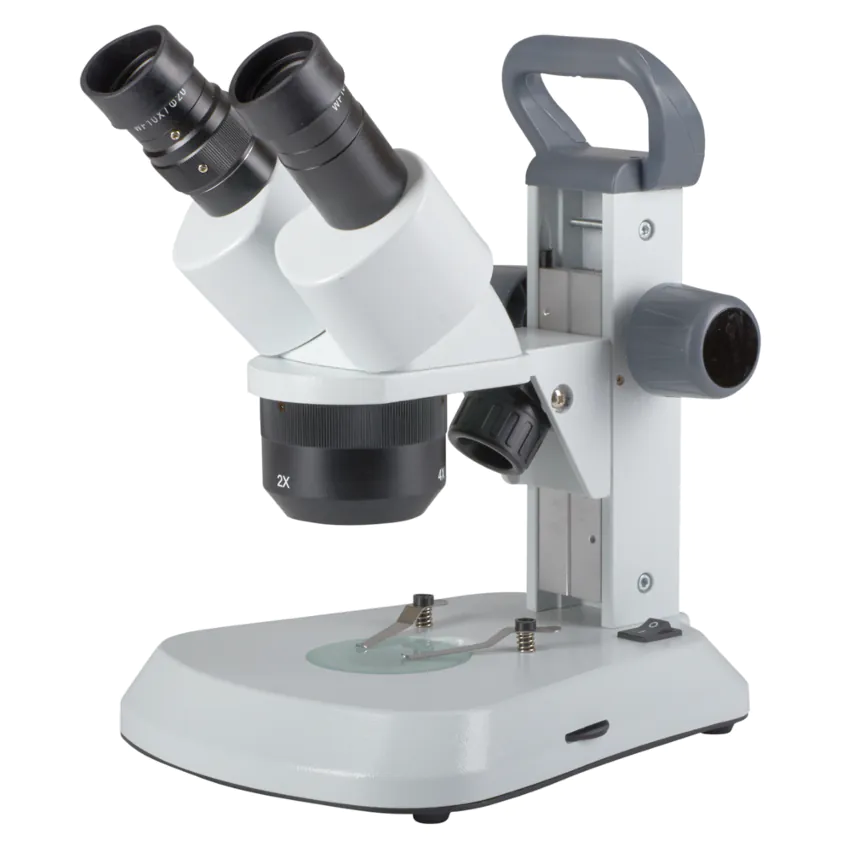 As with most stereo microscopes, the OM124L includes dual-sided coarse focus controls with over-sized knobs which are easier for student hands to use. Top and bottom illumination is powered by 110V ac or rechargeable LED with three settings: top, bottom and top and bottom together.