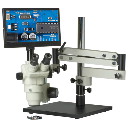 The Omano OM2040-V7 is another versatile addition to our dual-power Omano boom microscope lineup. Designed for industrial inspection applications, it is available in either binocular or trinocular configuration and offers 20x/40x magnification. The V7 is our heavy-duty articulating-arm boom stand that has been a proven workhorse for over ten years. A ring illumination is included. Lifetime Limited Warranty.
