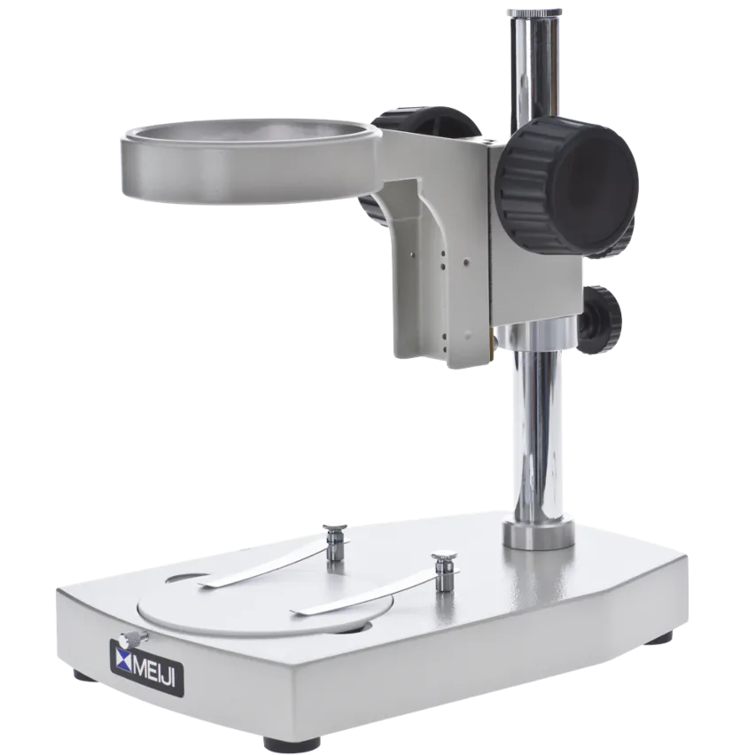 The P is a versatile and cost-effective 20mm diameter pole stand which includes an F-size focus block and plain base. The focusing block features dual coarse focus knobs, rack and pinion gearing, a safety clutch with tension adjustment and 55mm of travel. The base base includes reversible white & black stage plate and two stage clips.